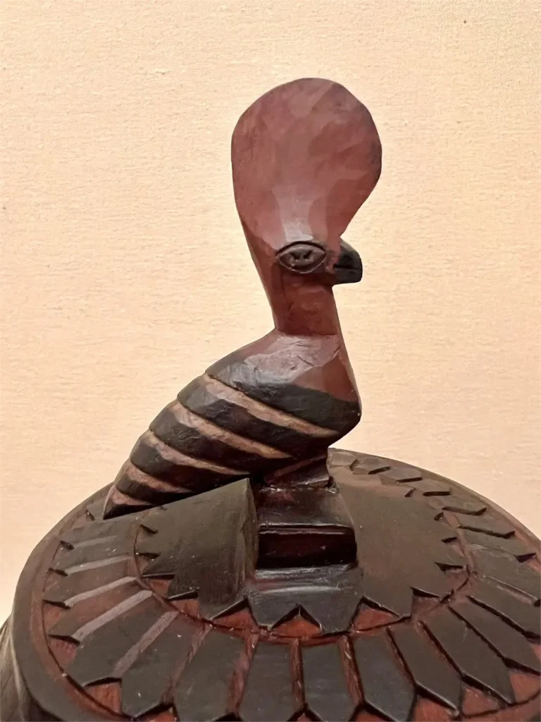 Le couvercle est surmonté d’un oiseau sculpté servant de poignée.