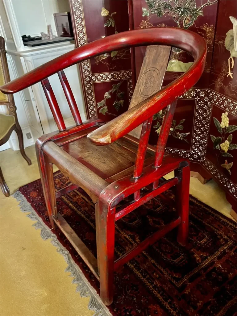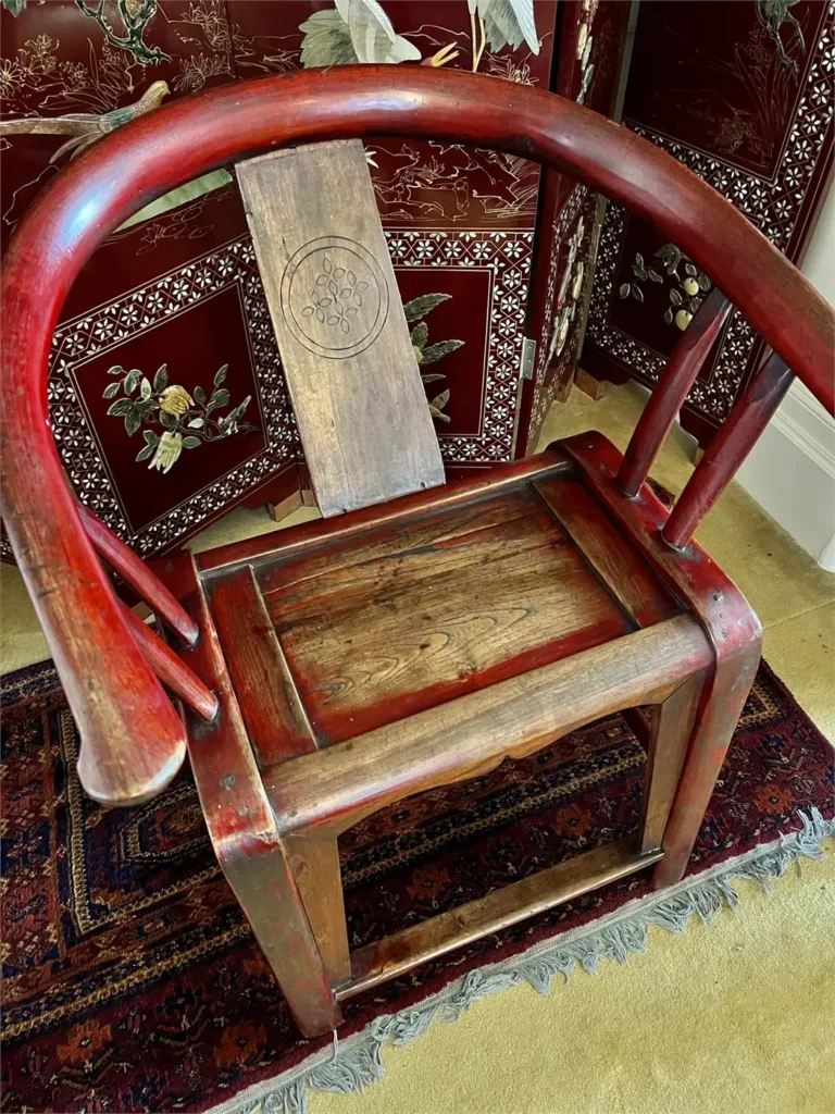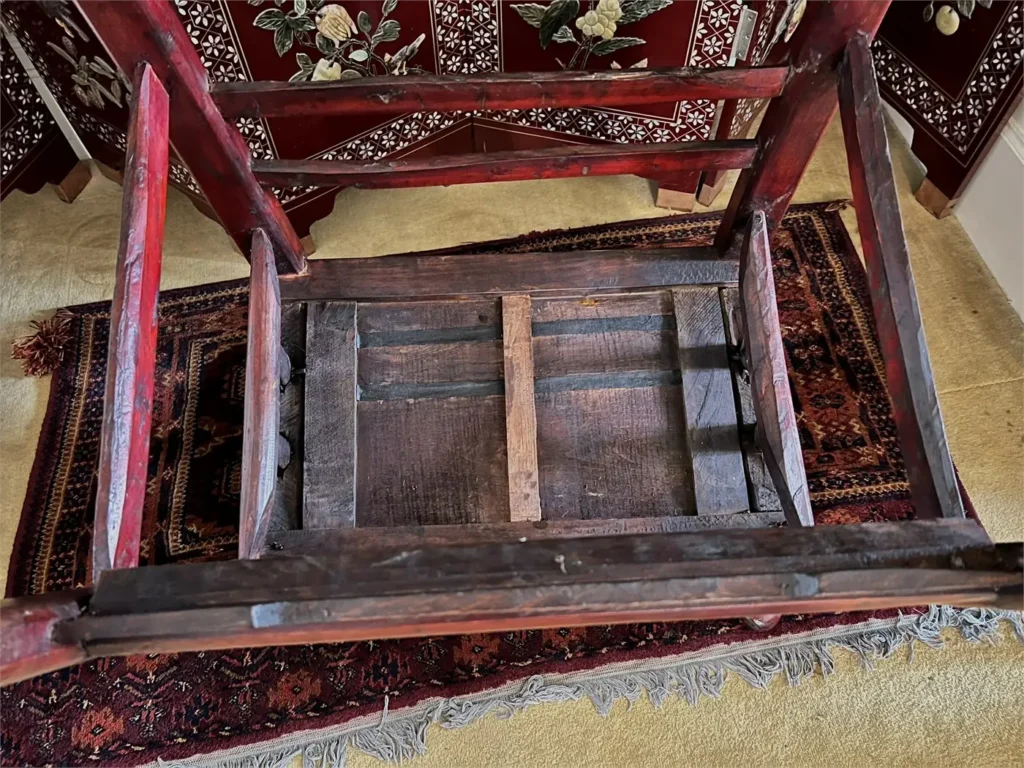 Le bois, présente une superbe patine ancienne, avec une usure naturelle harmonieuse. La laque rouge d’origine s’est adoucie avec le temps, laissant apparaître le bois par endroits et créant un contraste très esthétique.