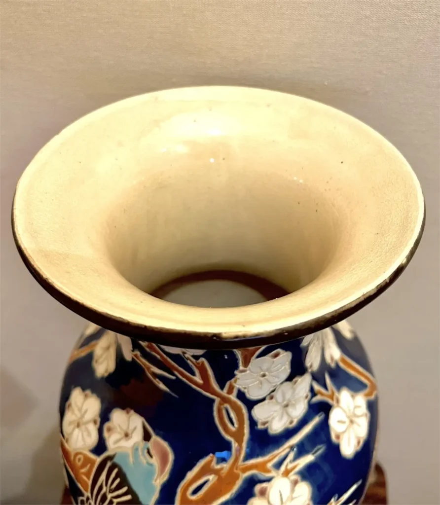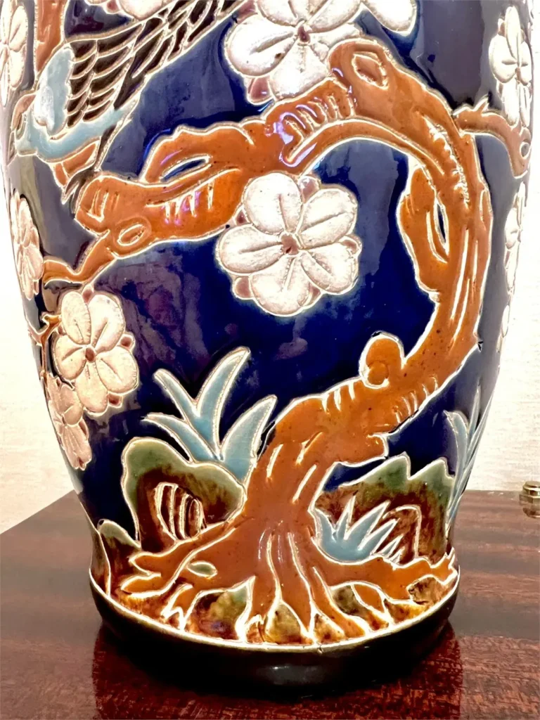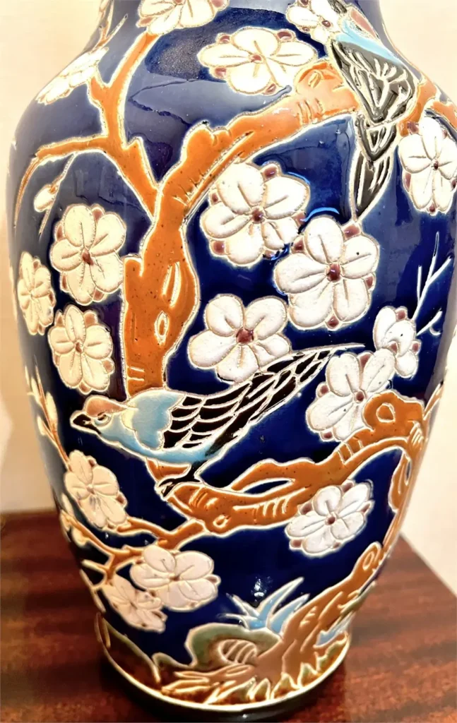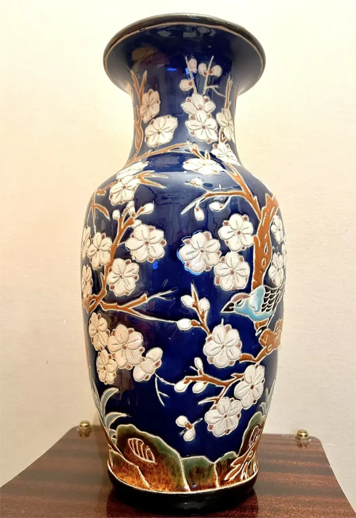 Vase en faïence émaillée à décor en relief représentant des branches de prunus en fleurs animées d’oiseaux stylisés. Le décor se détache sur un fond bleu profond, avec un travail de matière qui capte bien la lumière et donne du relief à l’ensemble.