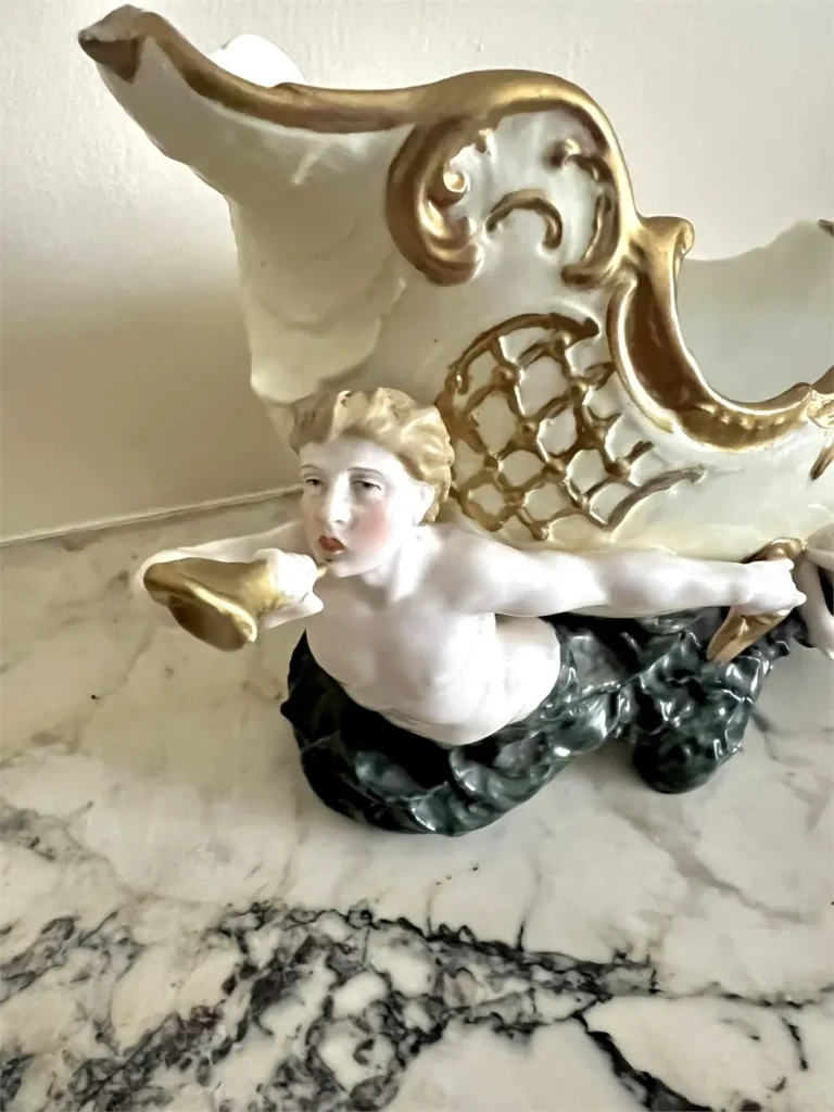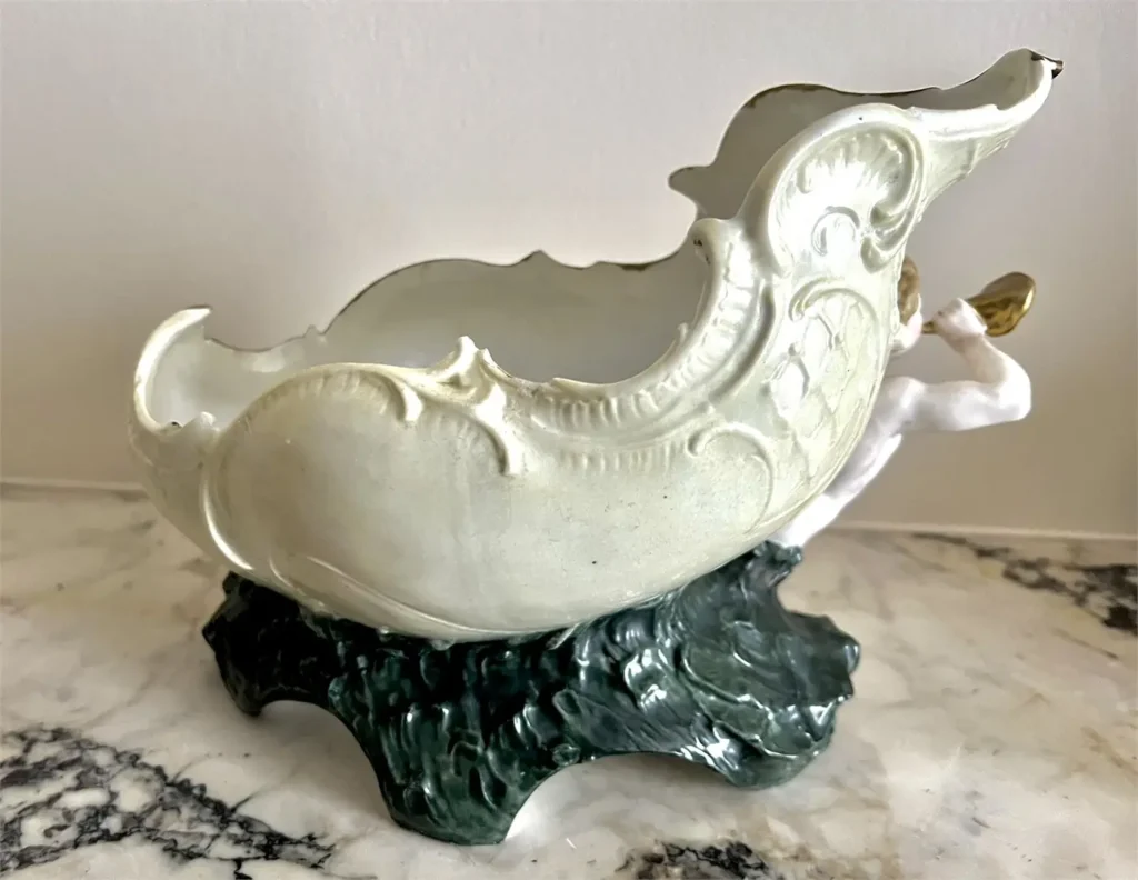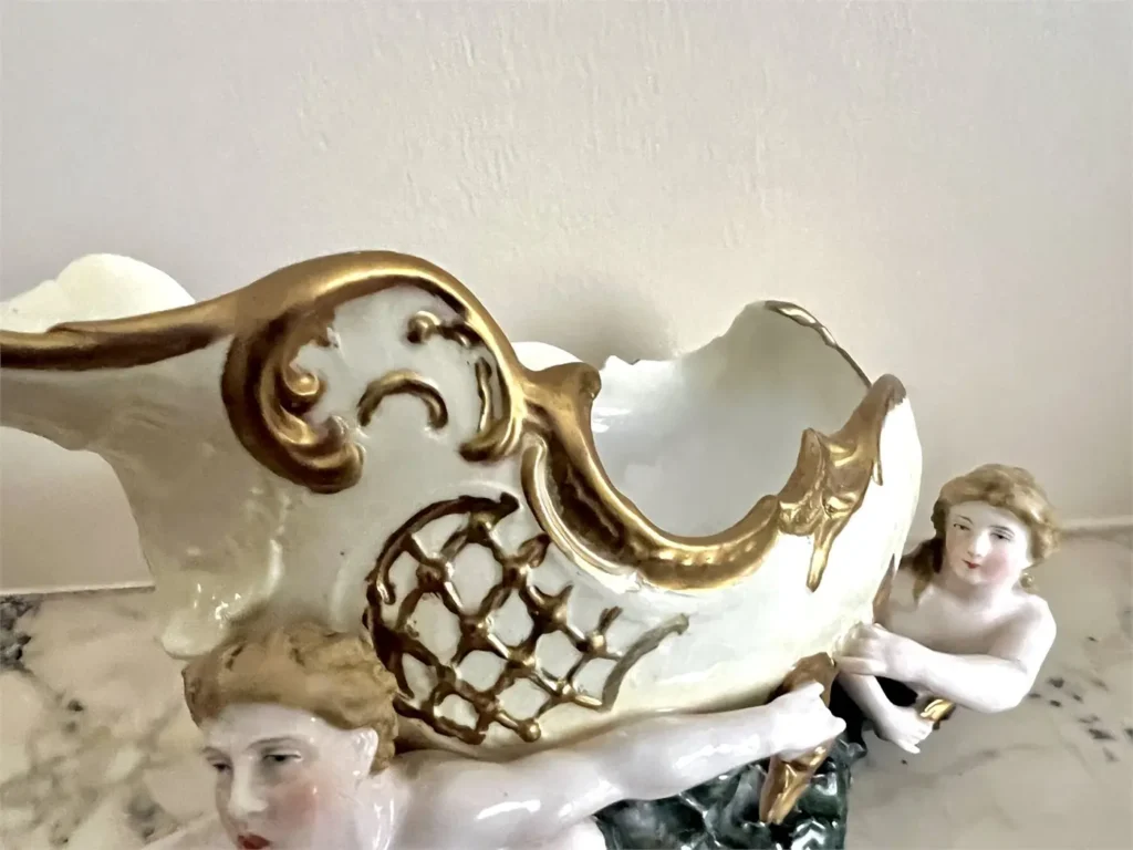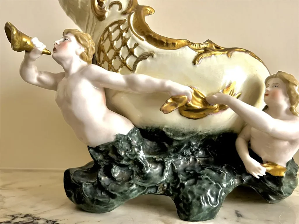 Coquille ajourée (façon nautile) soutenue par deux figures mythologiques marines. À l’avant, un Triton soufflant dans une conque ; à l’arrière, une Naïade retenant un drapé.