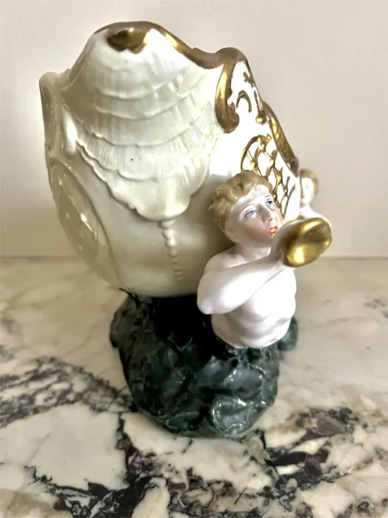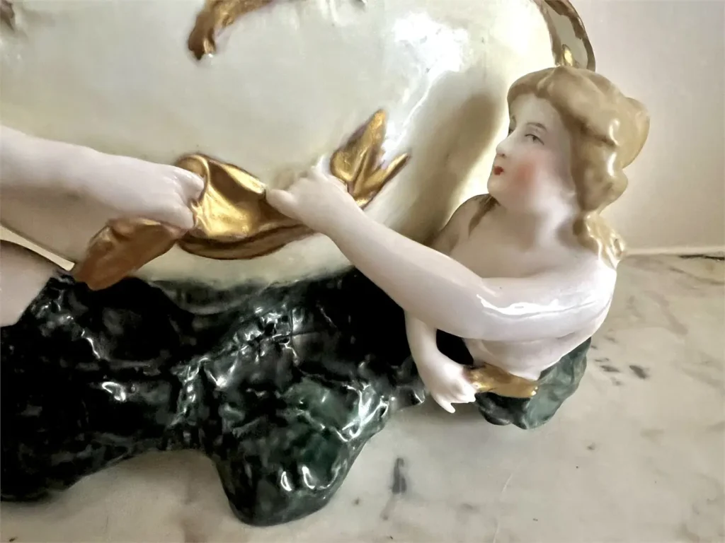 Beau contraste visuel entre la base vert profond évoquant les vagues tourbillonnantes, la carnation délicate des personnages et les riches rehauts d’or appliqués sur le col et la coquille.