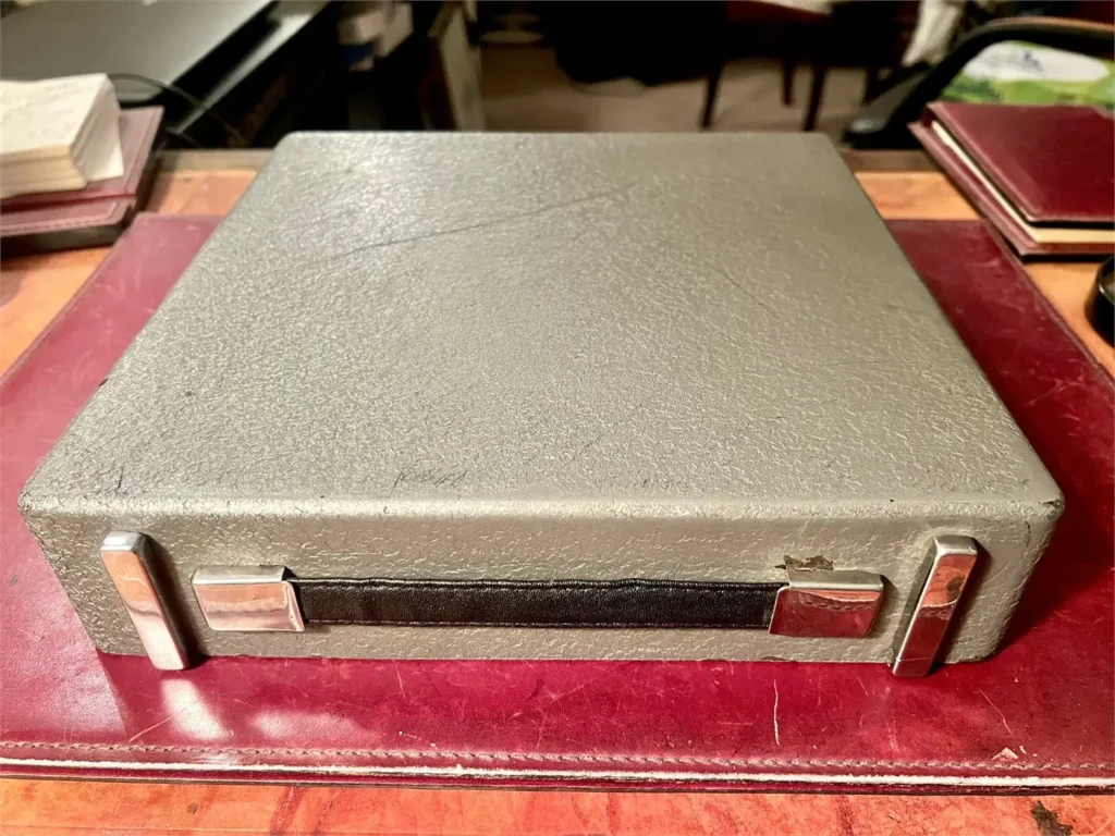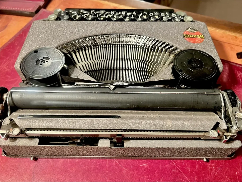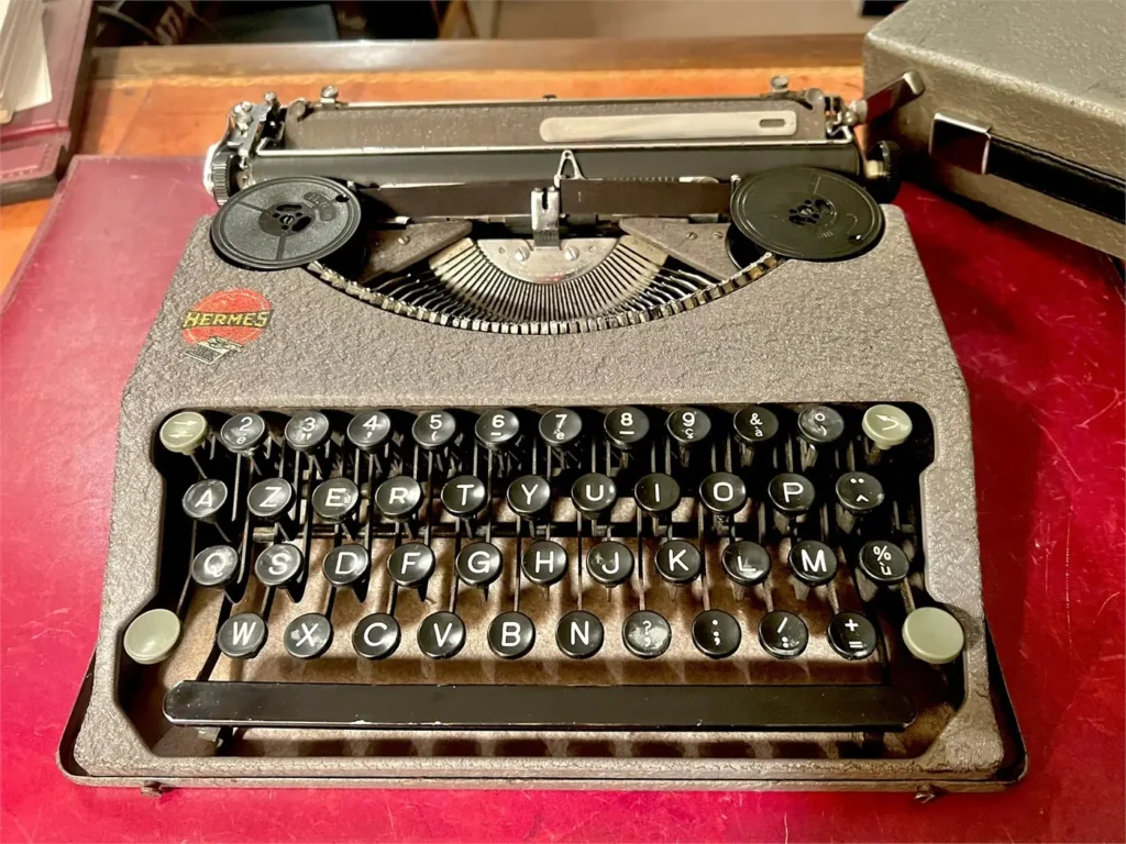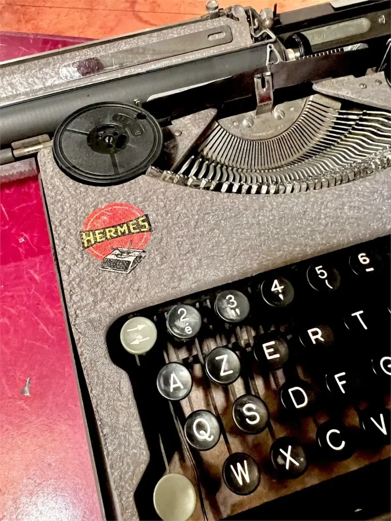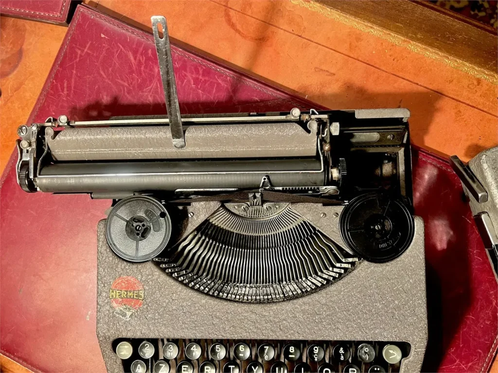 Modèle emblématique des premières séries d’avant-guerre, reconnaissable à sa finition martelée gris clair et à son format ultra-compact. La Hermes Baby est considérée comme l’une des portables les plus abouties de son époque, pour sa précision mécanique et sa fiabilité. Ce type de machine accompagnait fréquemment journalistes, écrivains et voyageurs tels qu’Ernest Hemingway ou Max Frisch.