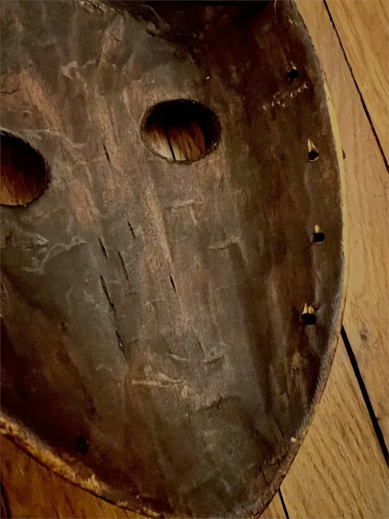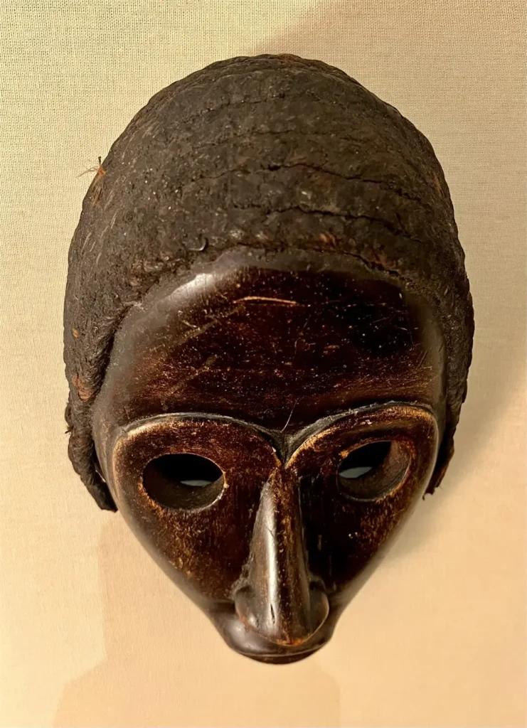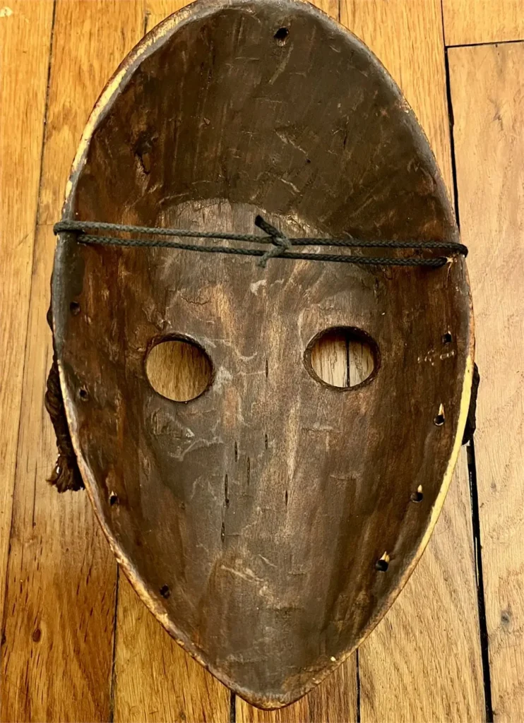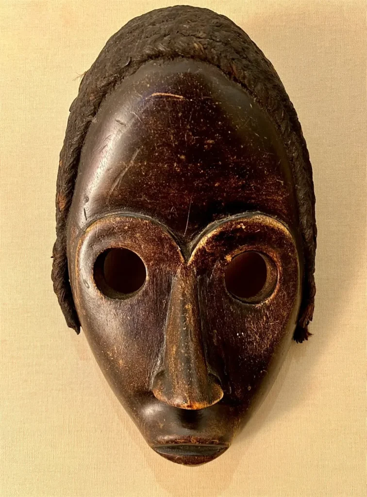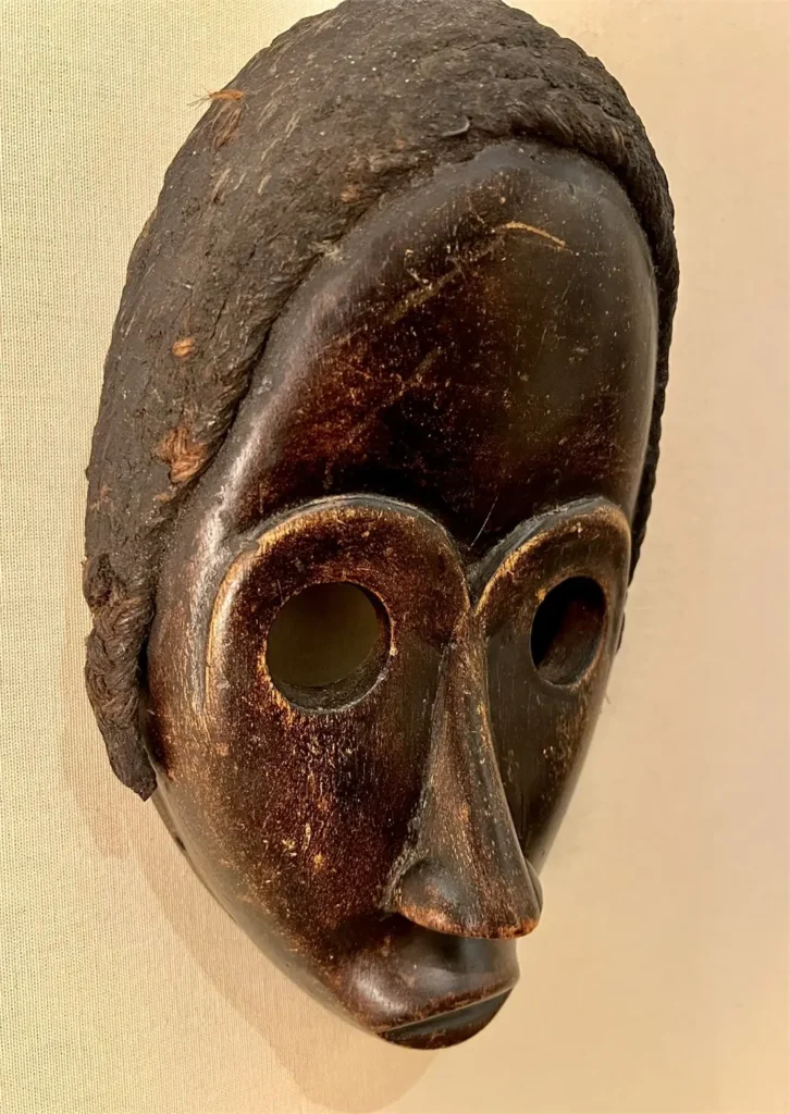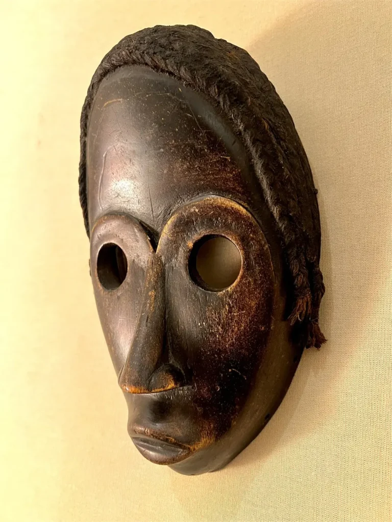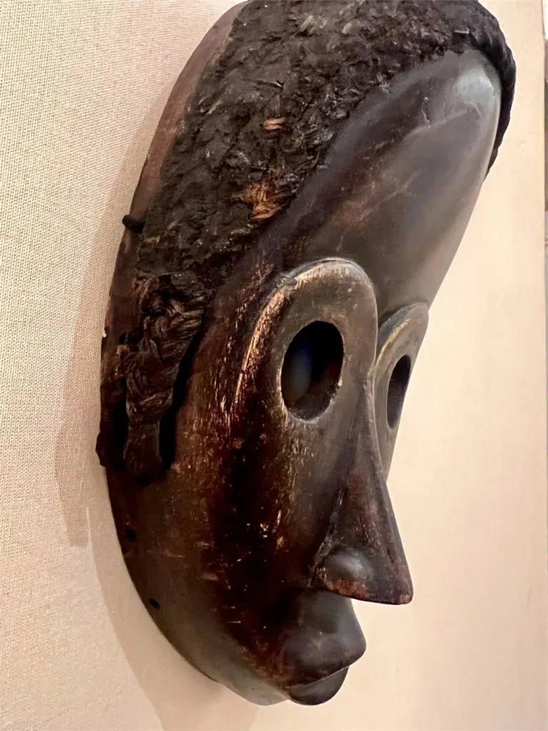 Le visage présente les caractéristiques classiques de ce type de masque : forme ovale allongée, yeux circulaires creusés, nez long en arête et bouche fine légèrement projetée. L’ensemble est traité de manière sobre, avec une belle patine brun foncé.