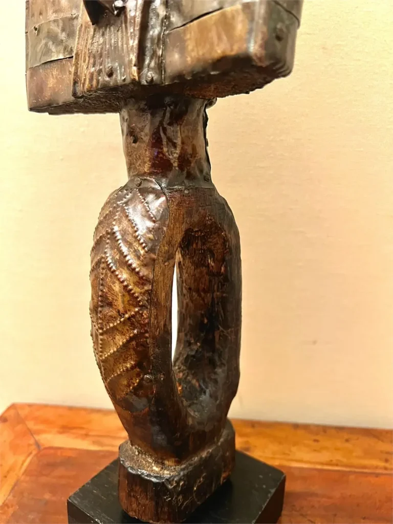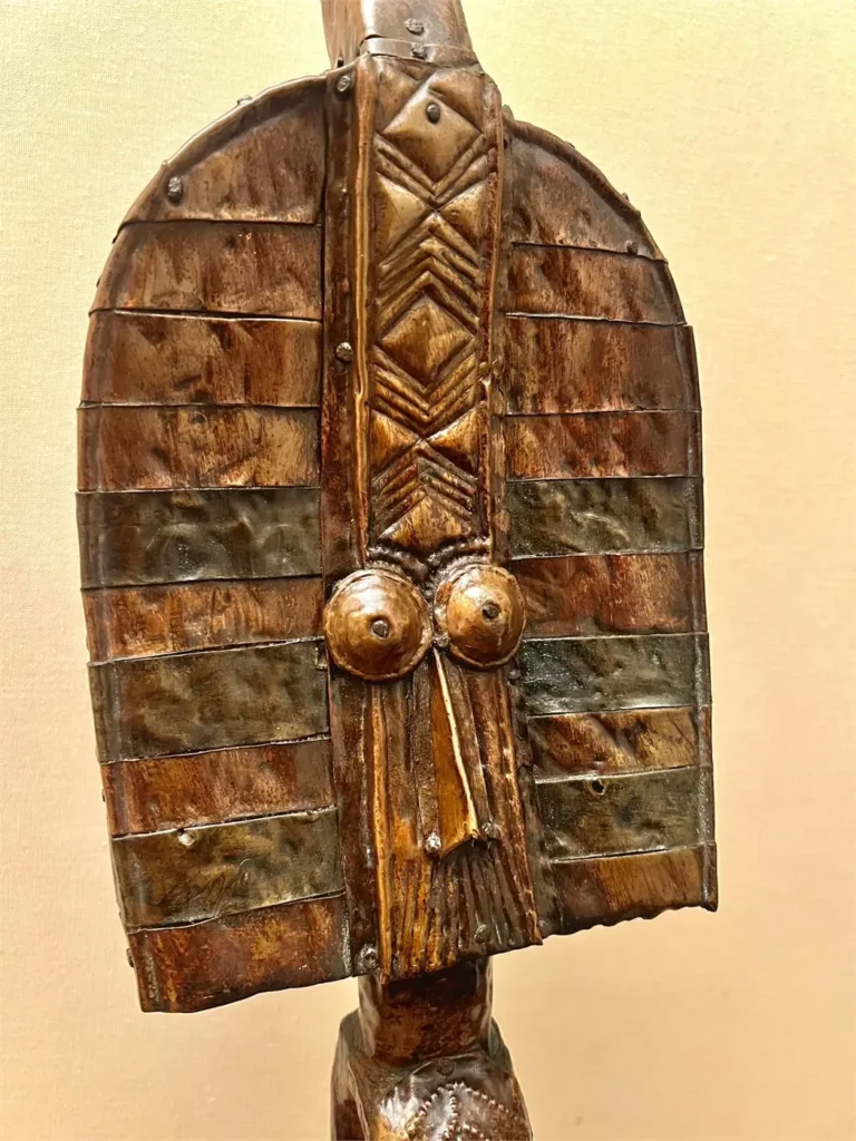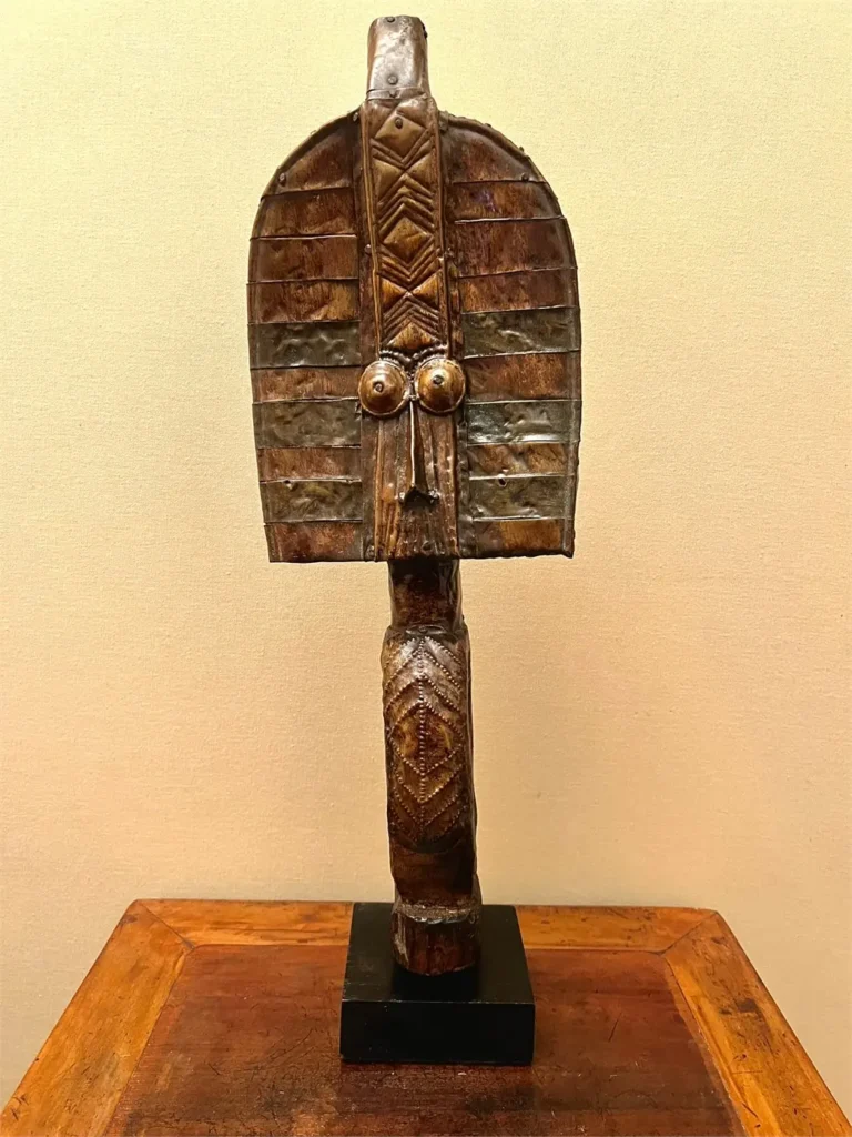 Ces figures étaient traditionnellement fixées au sommet de paniers contenant les reliques familiales et servaient à protéger les ancêtres. Elles sont caractéristiques des arts d’Afrique centrale et reconnaissables à leur visage en forme de bouclier recouvert de métal.