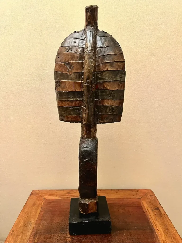 La sculpture est réalisée en bois recouvert de lamelles de cuivre martelé et clouté, avec un décor géométrique central et des yeux bombés métalliques typiques.